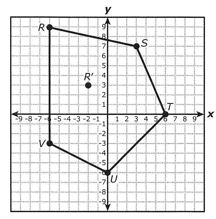 Pentagon RSTUV is shown on the coordinate grid. It will be dilated with the origin as the center of dilation using the rule (x, y) → (ax, ay) to create quadrilateral R'S'T'U'V'. If vertex R’ will be located at (-2, 3), what is the value of the scale factor a?