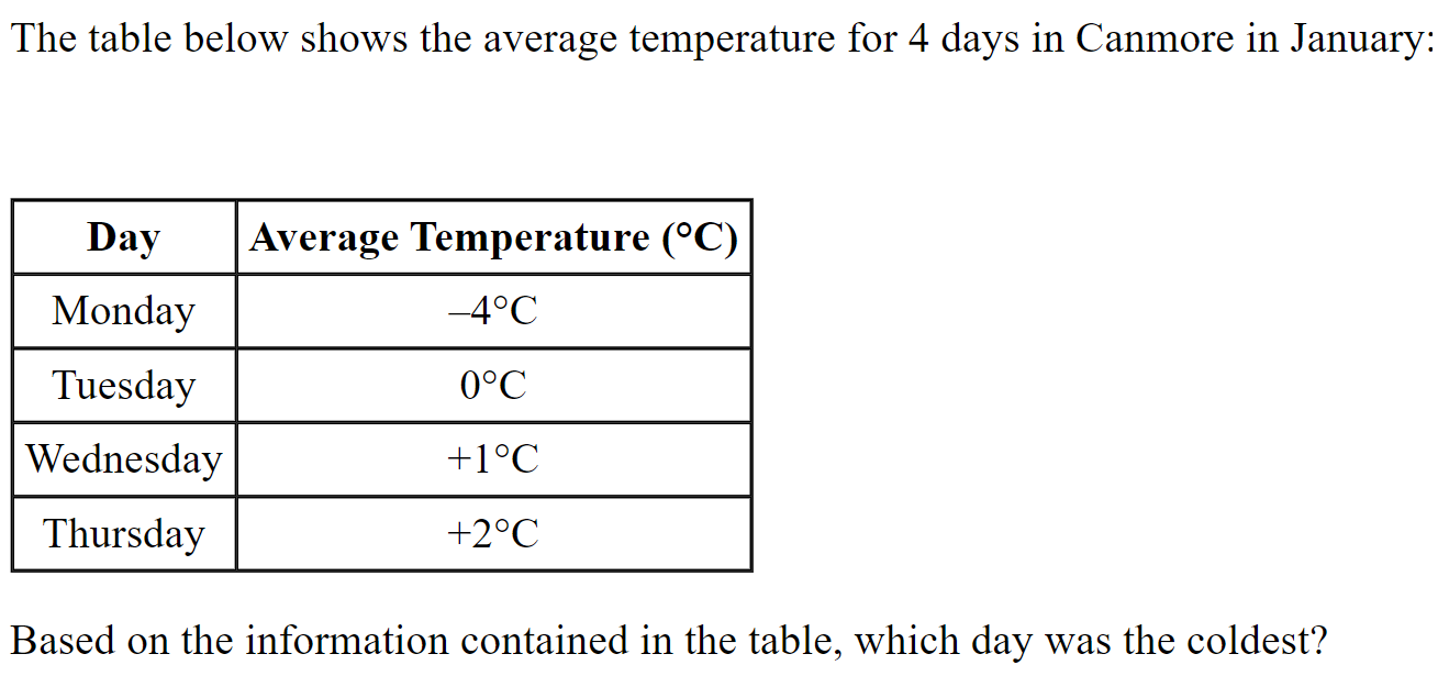 Boston has a temperature of -20 degrees. It is colder in New York than it is in Boston. Select the value that could represent the temperature of New York.