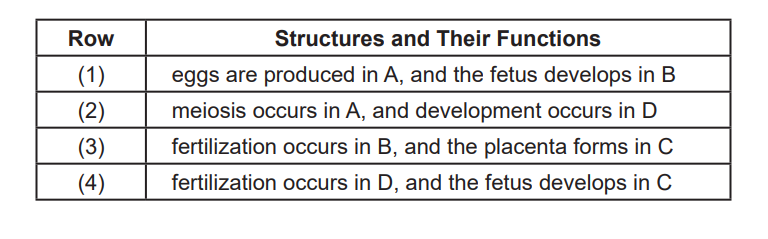 Which row in the chart correctly describes the normal function of two of the labeled structures?