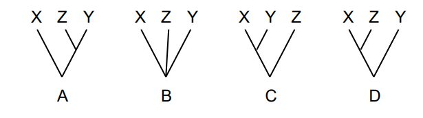 Write the letter of the diagram that shows that X and Y are more closely related to each other than to species Z.