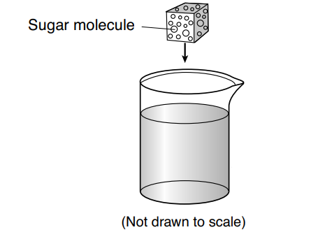The diagram represents a sugar cube being dropped into an undisturbed beaker of water at room temperature. One sugar molecule is labeled.