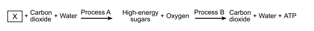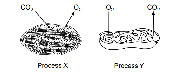 Two biological processes that occur in certain organelles are represented in the diagrams below.