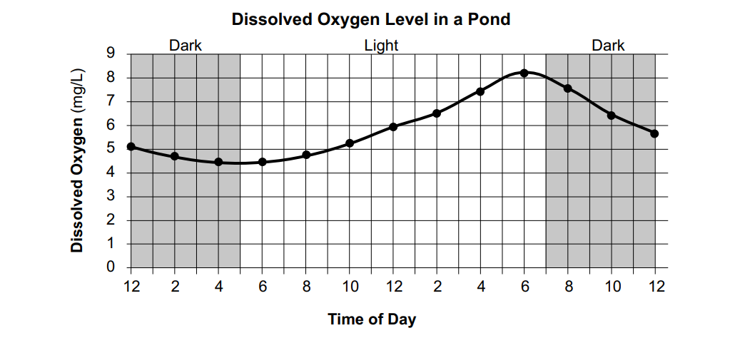 Base your answers to question 5 on the information and graph below and on your knowledge of biology. The graph below shows changes in dissolved oxygen in a pond in the summertime over a 24-hour period.