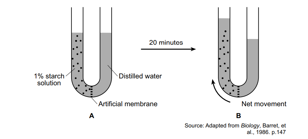 The diagram illustrates the movement of molecules across an artificial membrane in a U-shaped glass tube. A 1% starch solution was poured into the left side of the tube, and distilled water was placed in the right side of the tube.