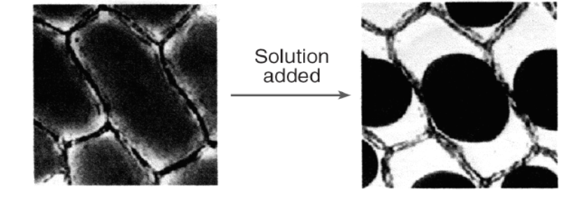 The diagram illustrates what happens when a particular solution is added to a wet-mount slide containing red onion cells being observed using a compound light microscope.