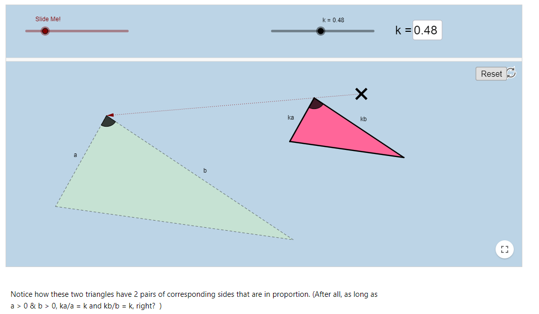 In the applet, you will find two triangles. The black angle in the green triangles is congruent to the black angle in the pink triangle. The black angle is included between sides a and b (green triangle) and between sides ka and kb (pink triangle).
