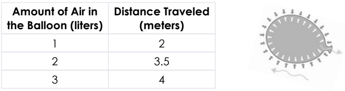 In an investigation, a balloon is filled with different amounts of air before being released to travel along a string like a rocket. The students recorded the following data: