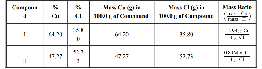 Consider the table below. Why are the mass ratios of copper and chlorine not the same for Compound I and Compound II?