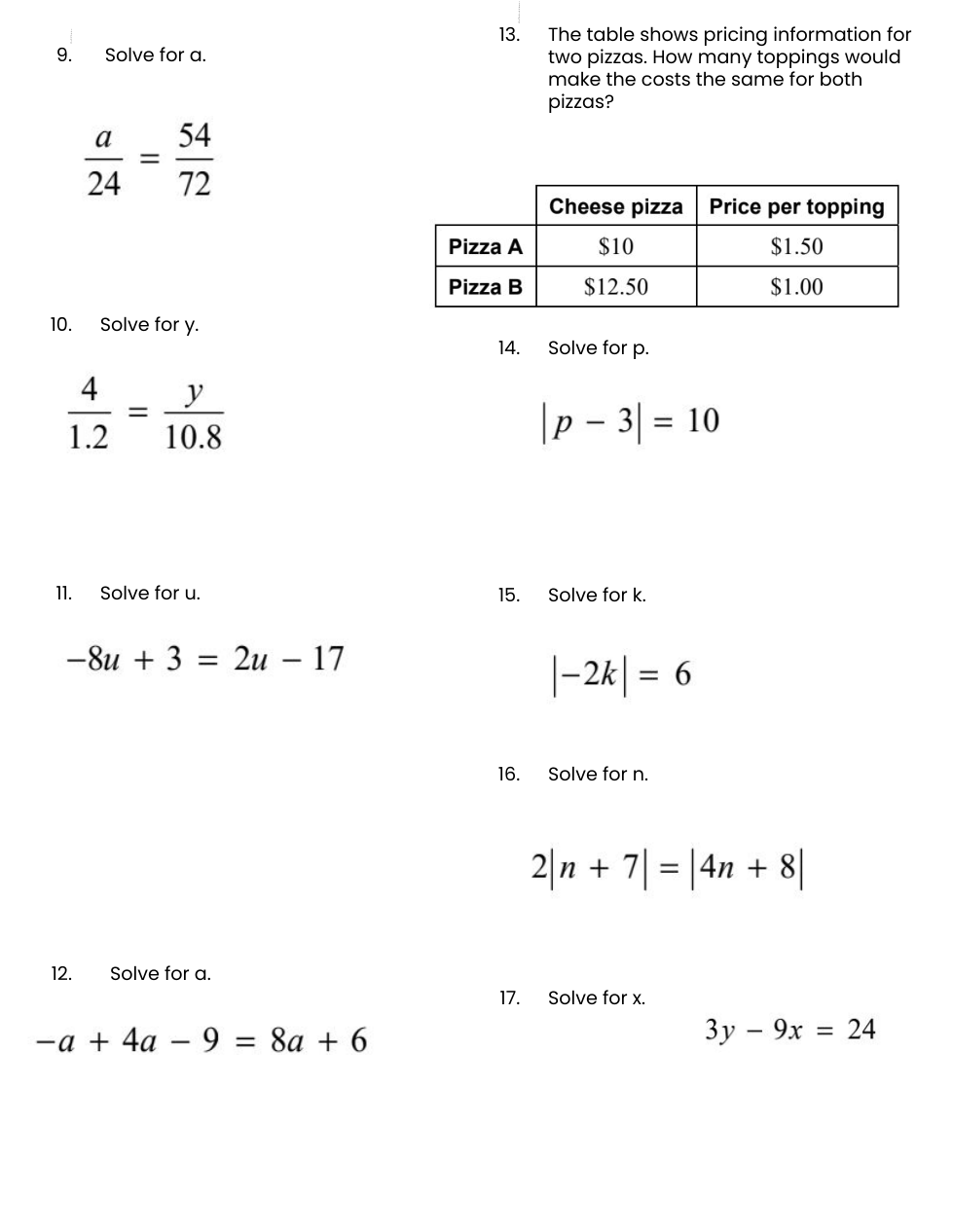 Show the equation you built for the word problem, and how many toppings it would take for the pizzas to cost the same.