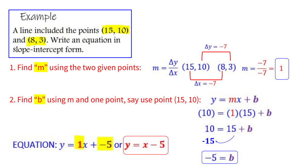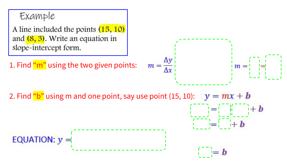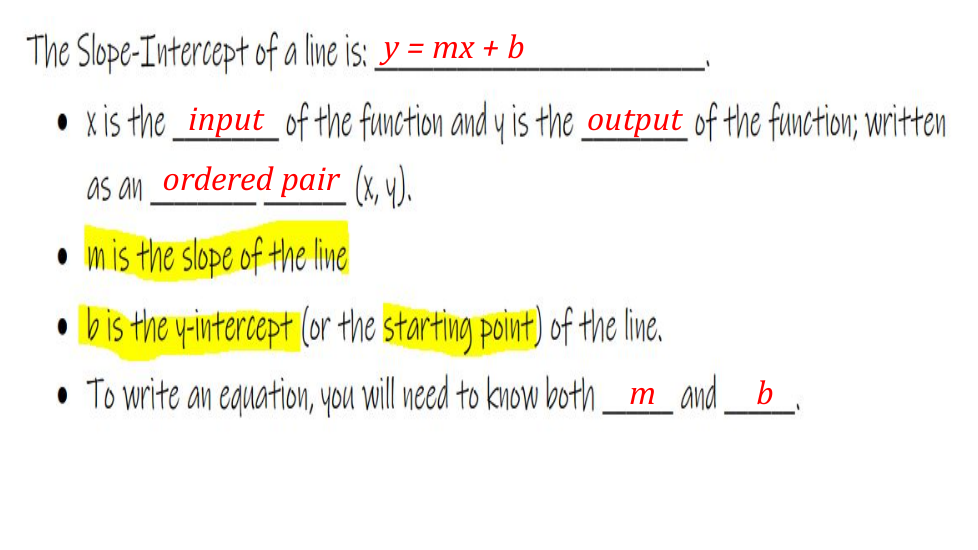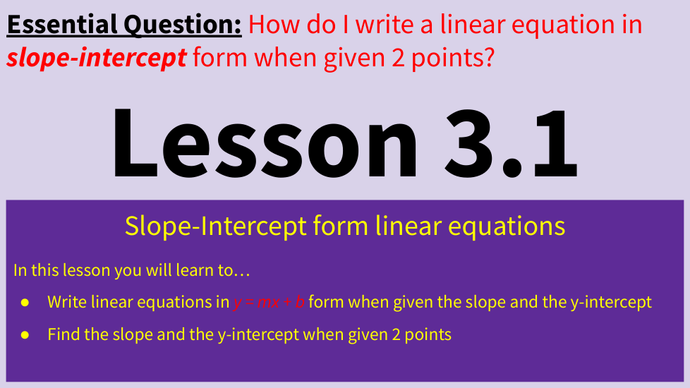 This is a review lesson over 2-variable linear equations learned in Algebra 1. Students are expected to be able to write linear equations using the slope and y-intercept. There are 3 different objectives: Students will be able to (1 - easy) write the equation when given slope and y-intercept, (2 - medium) write the equation when given slope and one point, and (3 - hard) write the equation when given 2 points.