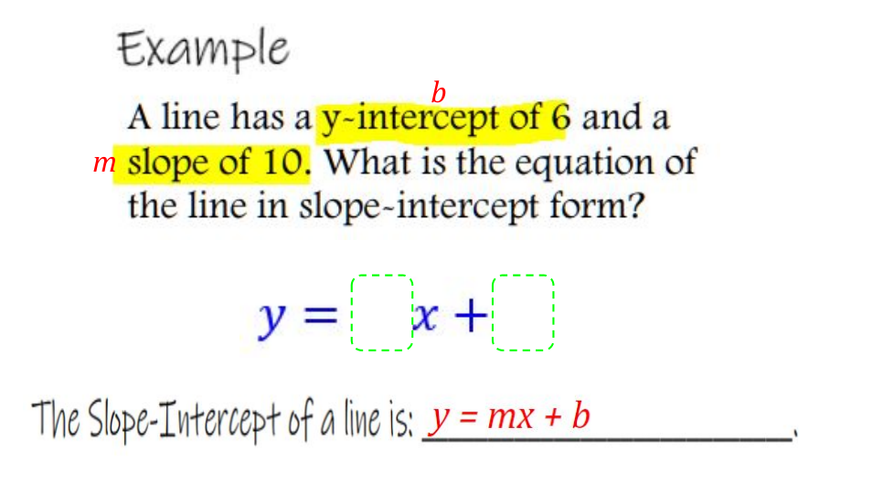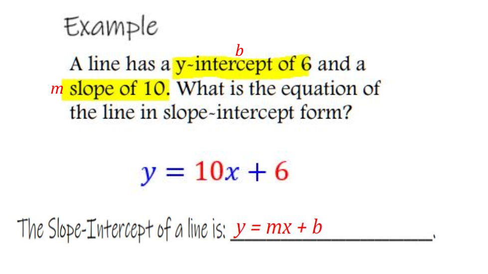 A line has a y-intercept of 6 and a slope of 10. Write the equation of the line in slope-intercept form.