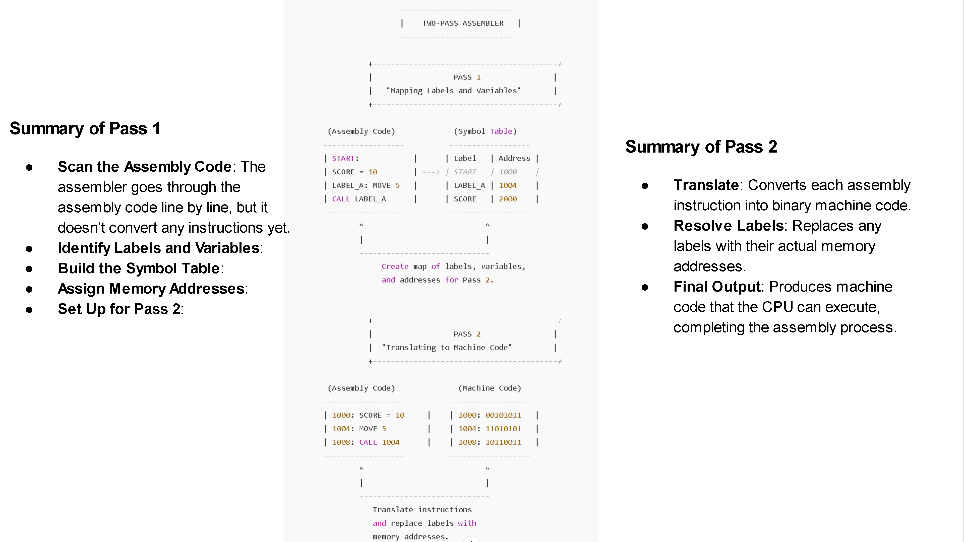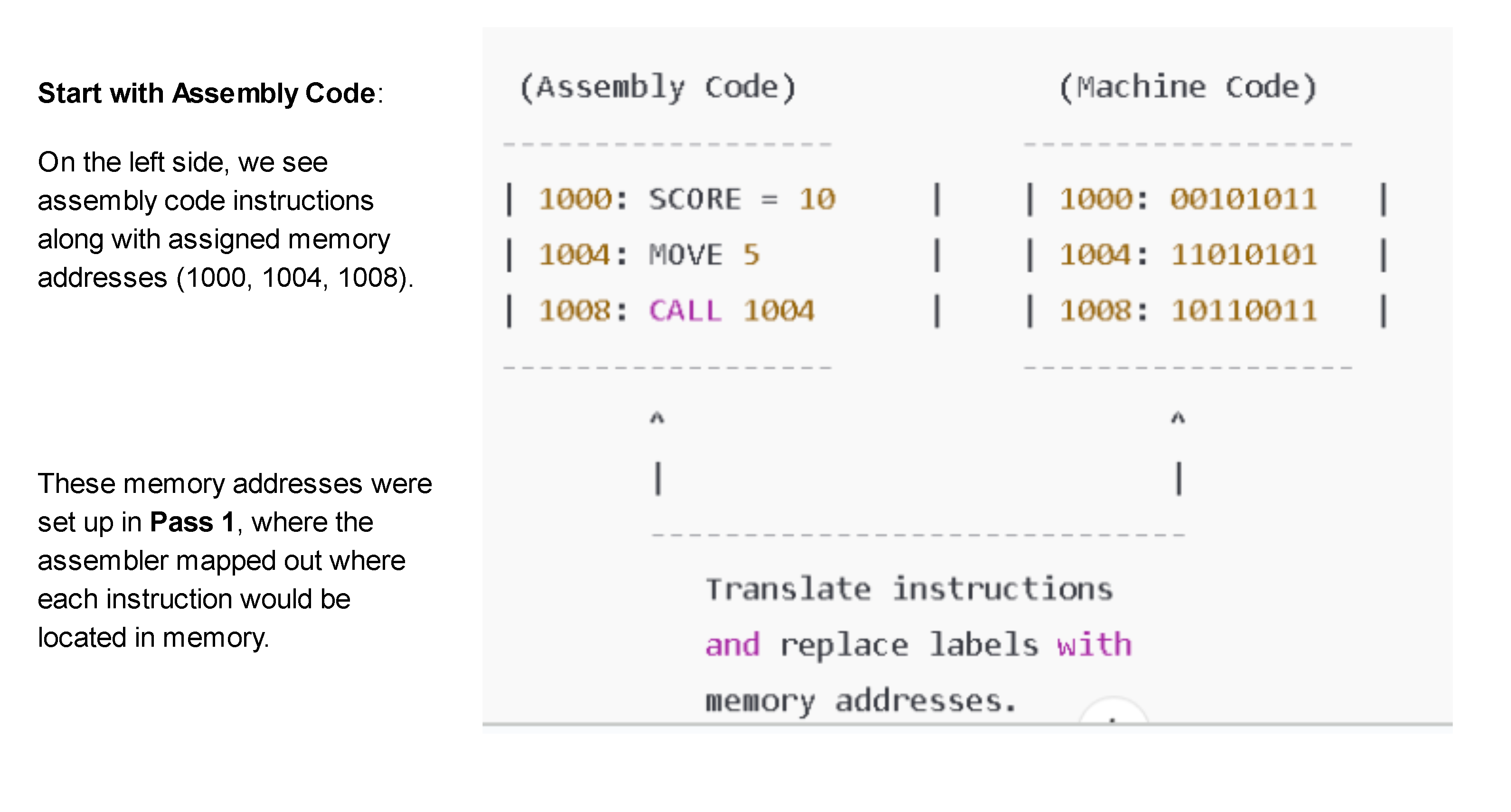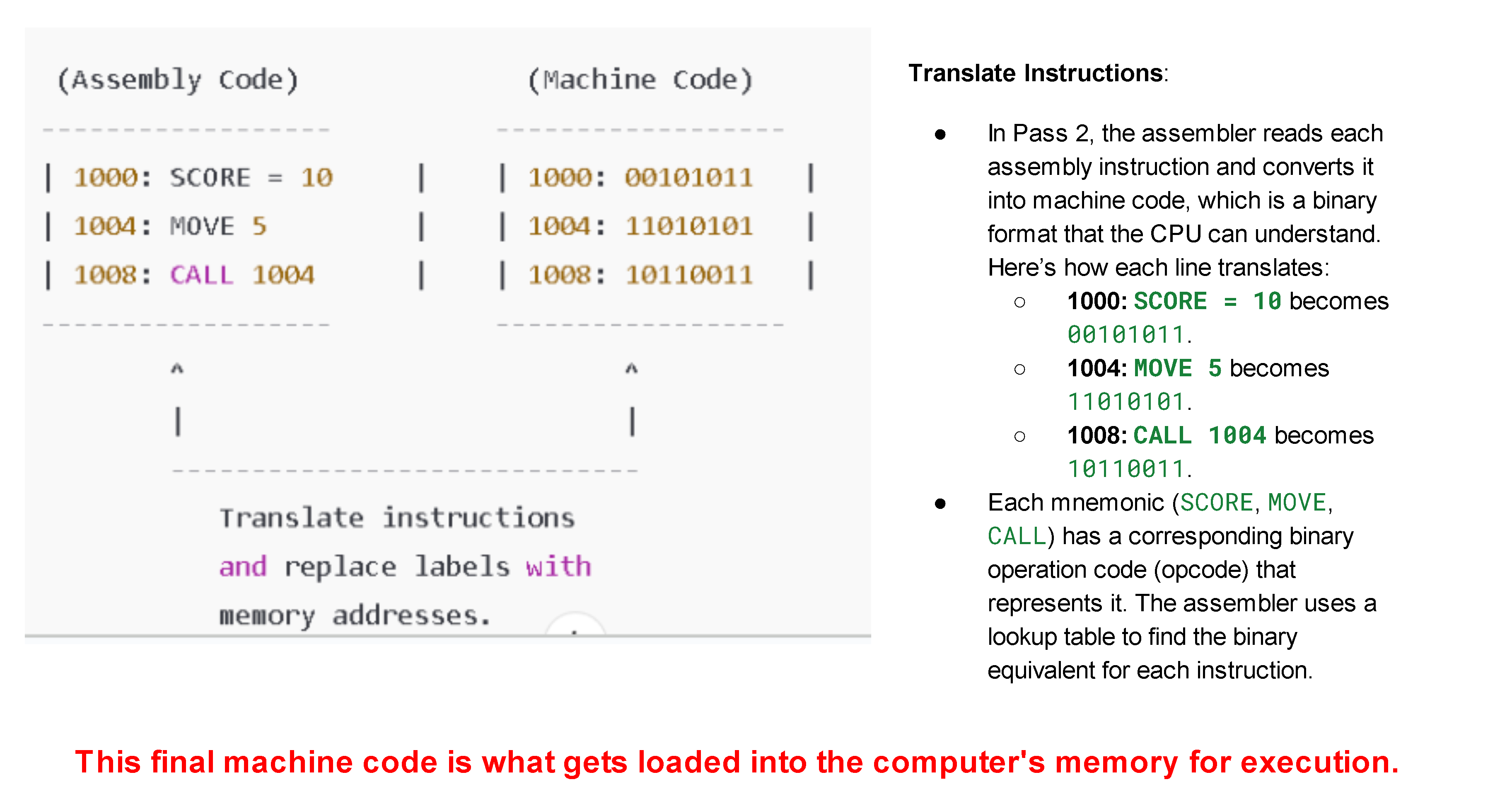 - Translation: To execute assembly code, it needs to be converted into machine code through an assembler. This process translates each mnemonic and symbolic representation into the corresponding binary machine code instructions.