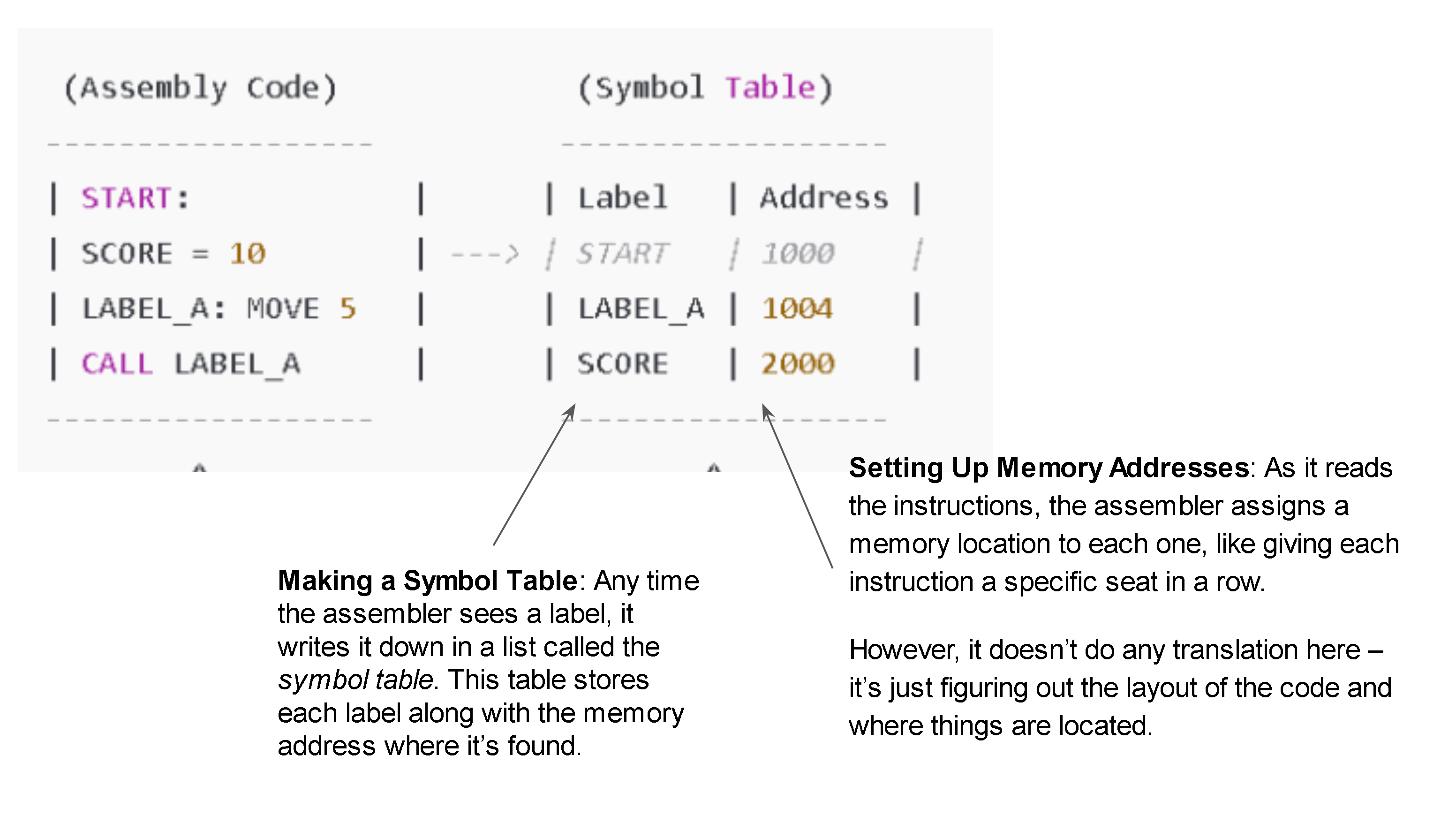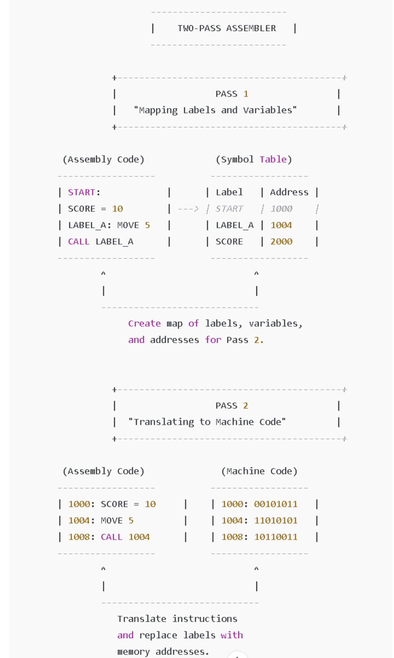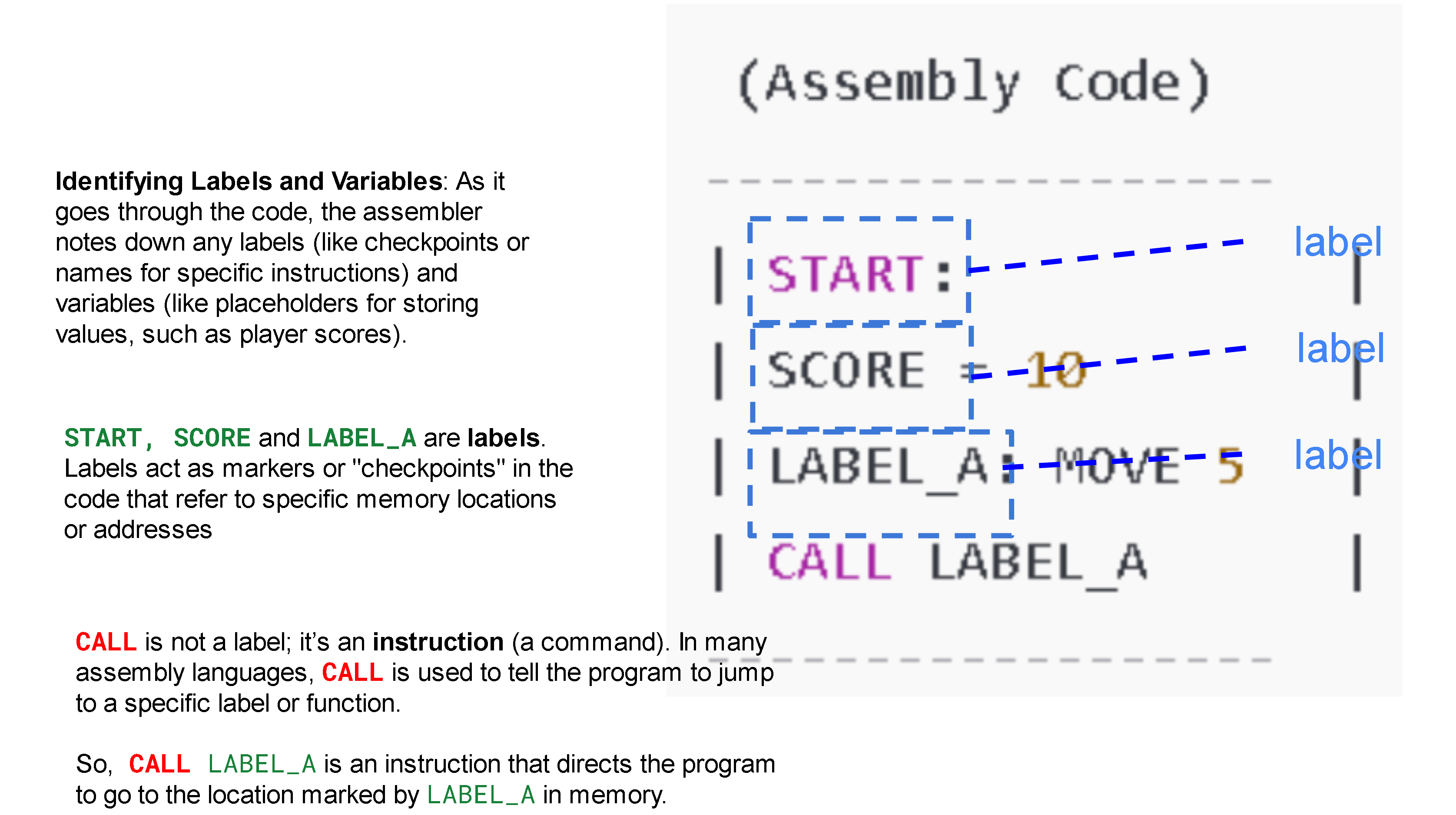 - Translation: To execute assembly code, it needs to be converted into machine code through an assembler. This process translates each mnemonic and symbolic representation into the corresponding binary machine code instructions.