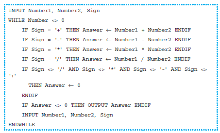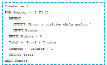 The following algorithm written in pseudocode adds up 10 positive numbers and outputs the total. It contains several errors.