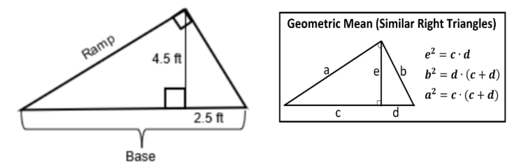 David is building a loading ramp to move materials onto delivery trucks. He knows the ramp has to be 4.5 feet high and the the front portion of the base is 2.5 feet. How long is the base of the ramp?