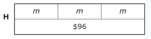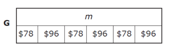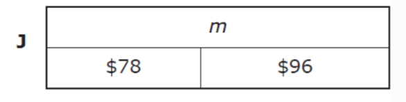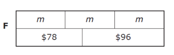 A business earned $96 for one job and $78 for a second job. The money was divided equally among the 3 partners who own the business. Which strip diagram represents m, the amount of money each partner received?