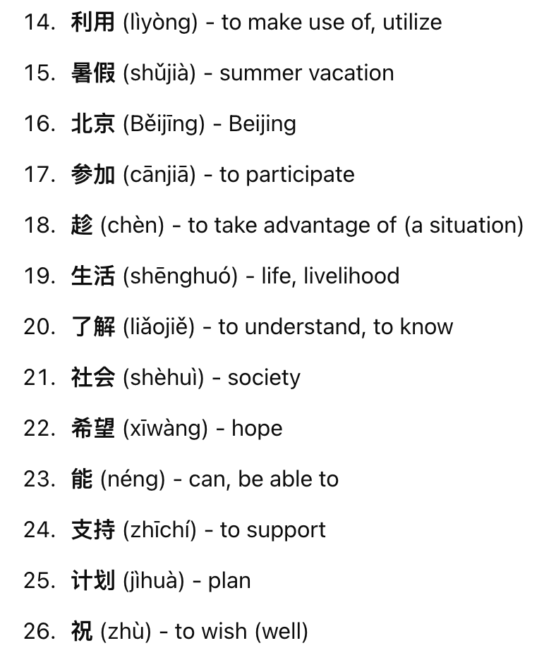 虽然学校语言实验室的设备很好,但是练习说中文的【5】还是不多,每星期除了上课以外,【6】在星期一晚上的中文桌子才能跟老师和同学【7】交流/communicate,所以我的口语【8】得很慢。我很想【9】今年暑假去北京【10】一个短期语言训练班,除了多学一点中文以外,也可以趁这个机会看看中国人的生活,【11】一下中国的社会,我希望爸妈能【12】我这个计划。