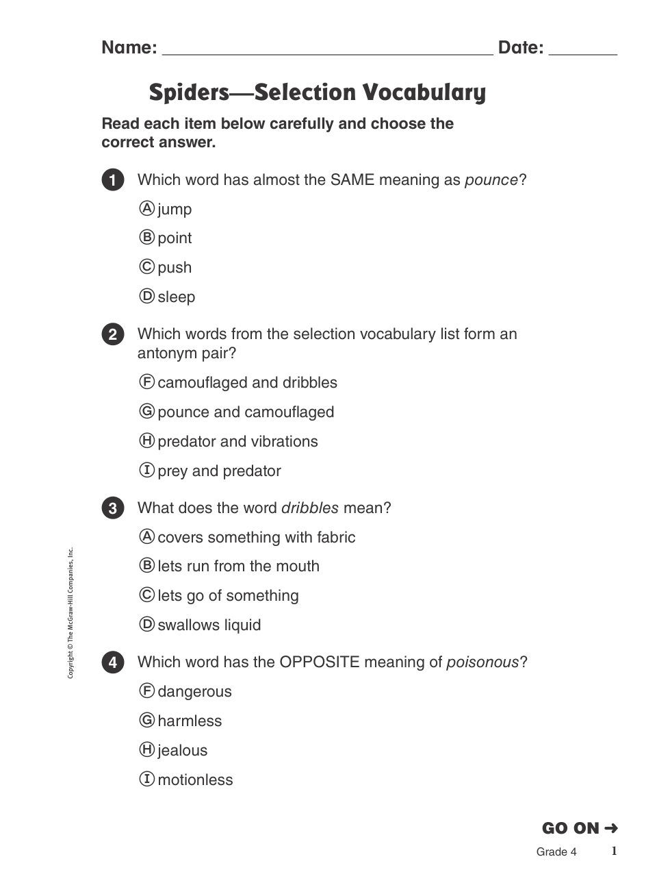Unit 2 weeks 1 and 2 Spiders Test 4th Grade