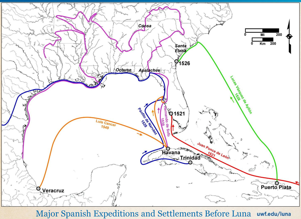 Spain tried again, sending Tristán de Luna and 1,500 soldiers and colonists from Mexico to colonize several key areas of the Southeast before the French could do so. They wanted to establish settlements at Pensacola (in Florida), Santa Elena (in South Carolina), and the large Indian town of Coosa in northwest Georgia. The de Luna expedition and its15 ships landed at Pensacola Bay. After a hurricane destroyed ships and supplies, they made their way inland in search of food. Entering present-day Georgia, they traveled to Coosa and remained for six months. However, after several more setbacks, Spain decided to give up its hopes for the de Luna colonies.
