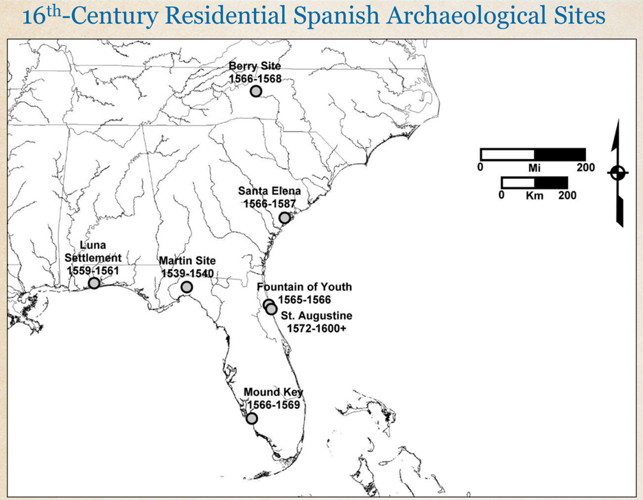 In 1565, nearly 30 years after DeSoto’s expeditions, Pedro Menéndez de Avilés established St. Augustine on Florida’s east coast, followed by Santa Elena on Parris Island in South Carolina. The new Florida colony was intended as a colonial base that could also protect the Bahamas Channel, a passageway for Spanish ships laden with gold and silver coming from South America.