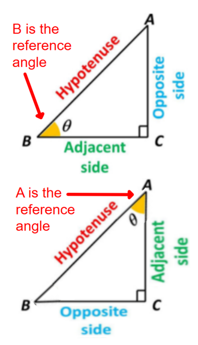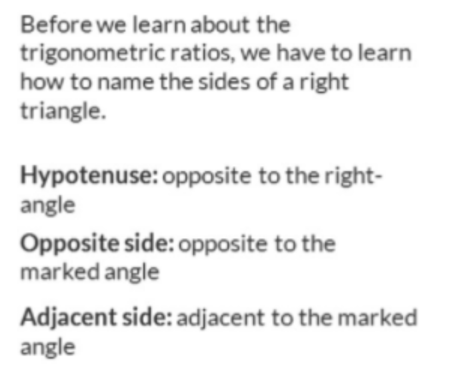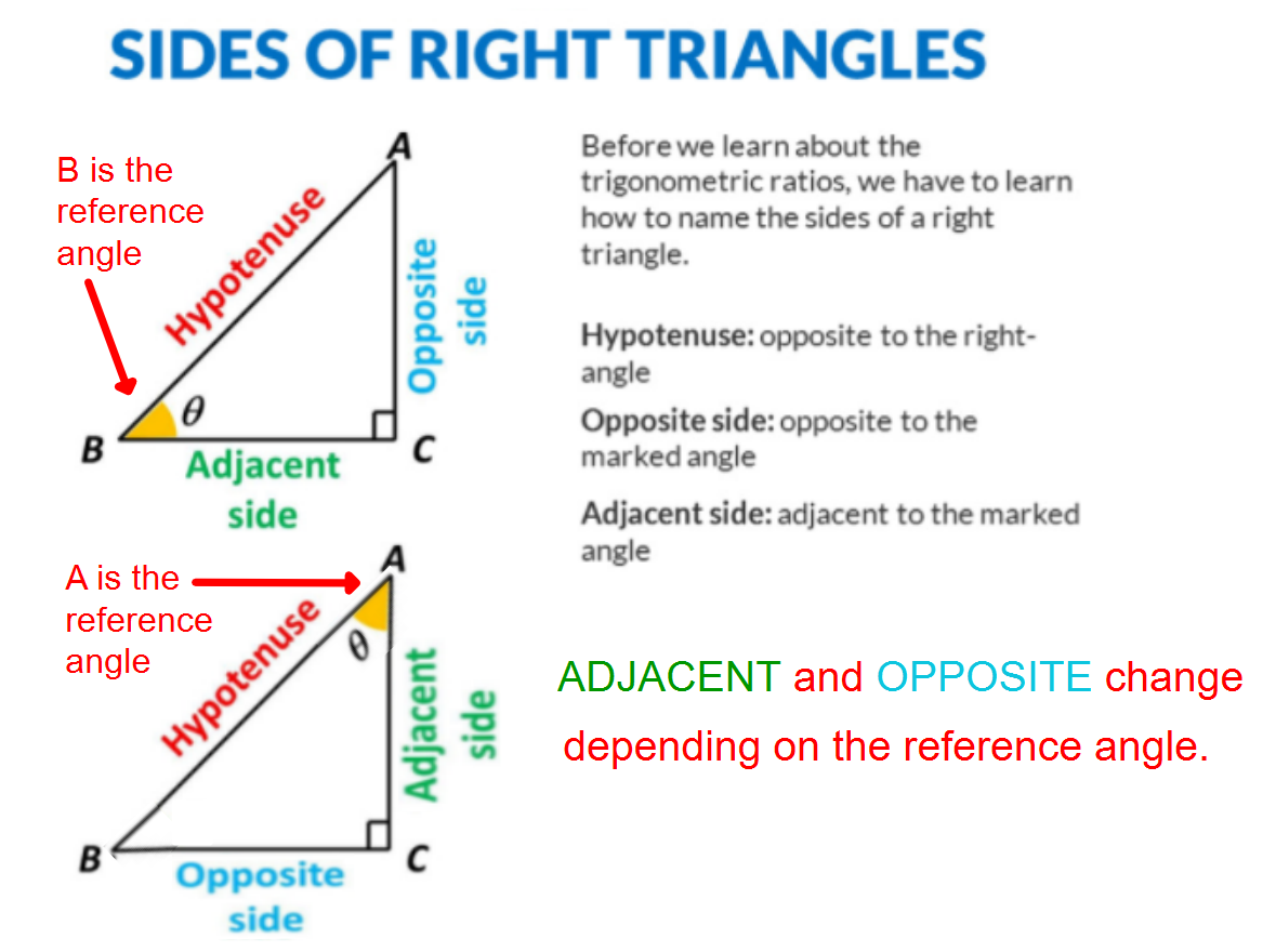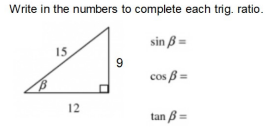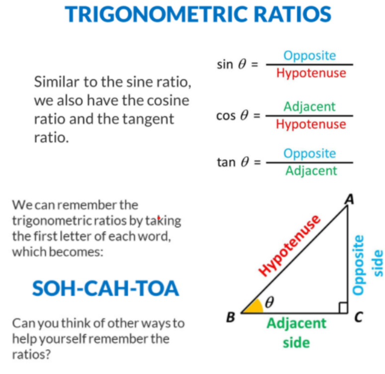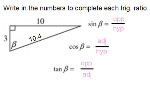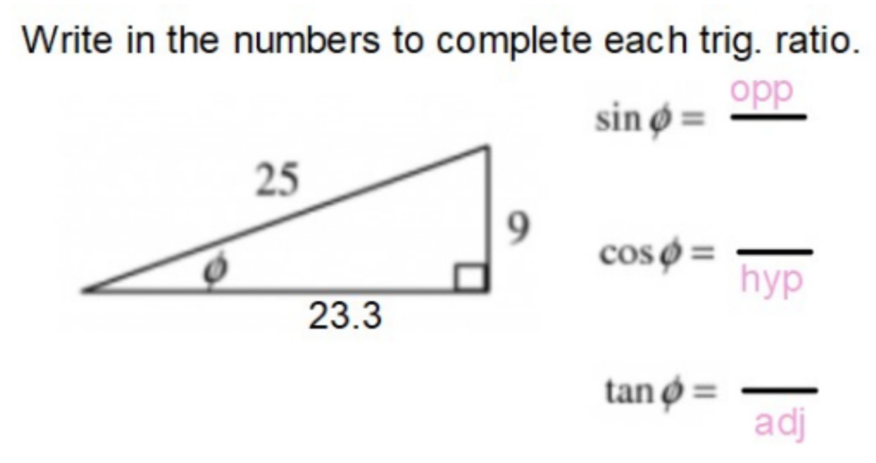 Complete the trigonometric ratios with H (Hypotenuse), O (Opposite side), and A (Adjacent side).