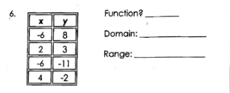 Express each relation as a table, graph , and a mapping. Then determine domain and range. FOR THIS QUESTION DO THE GRAPH The following points are (1,6) (-7, 3) for graohy 1