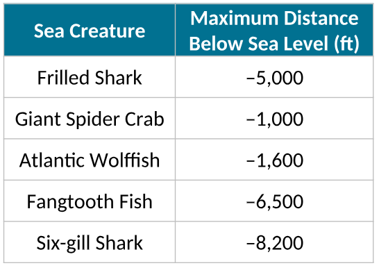 The table shows the maximum distance below sea level at which various sea creatures commonly live. Order the sea creatures from least to greatest according to their maximum distance below sea level.