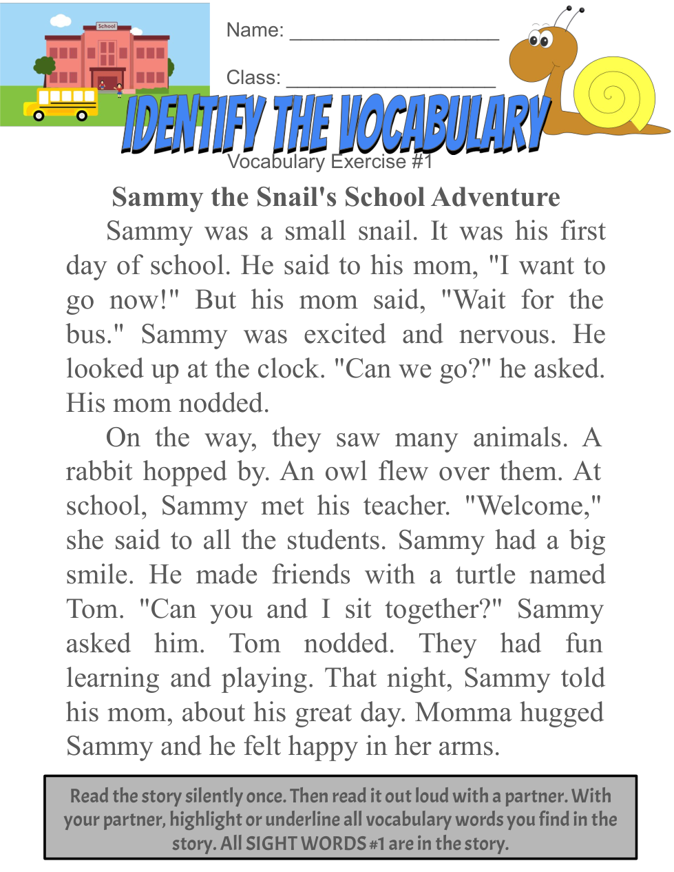 After completing the Sammy the Snail "Identify the Vocabulary" worksheet and the A Trip To The Zoo "Fill-In-The-Blank", read the stories out loud through a video recording and answer the questions.