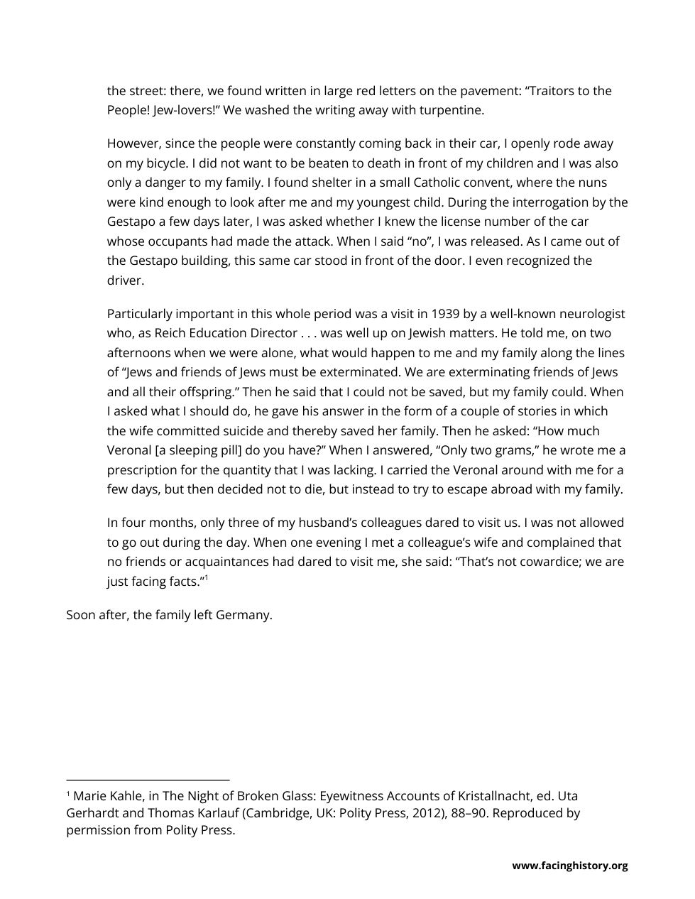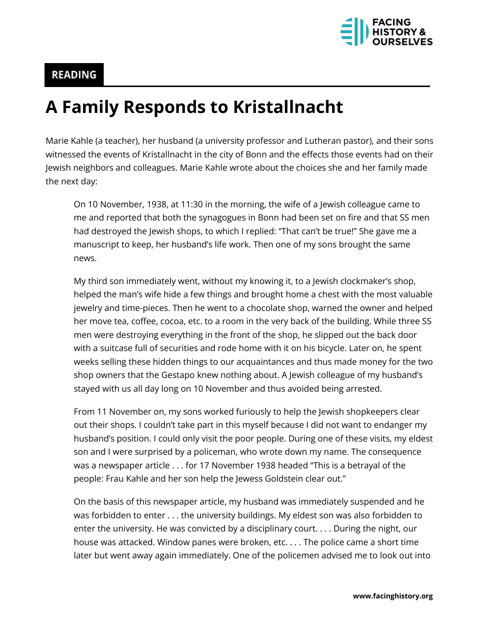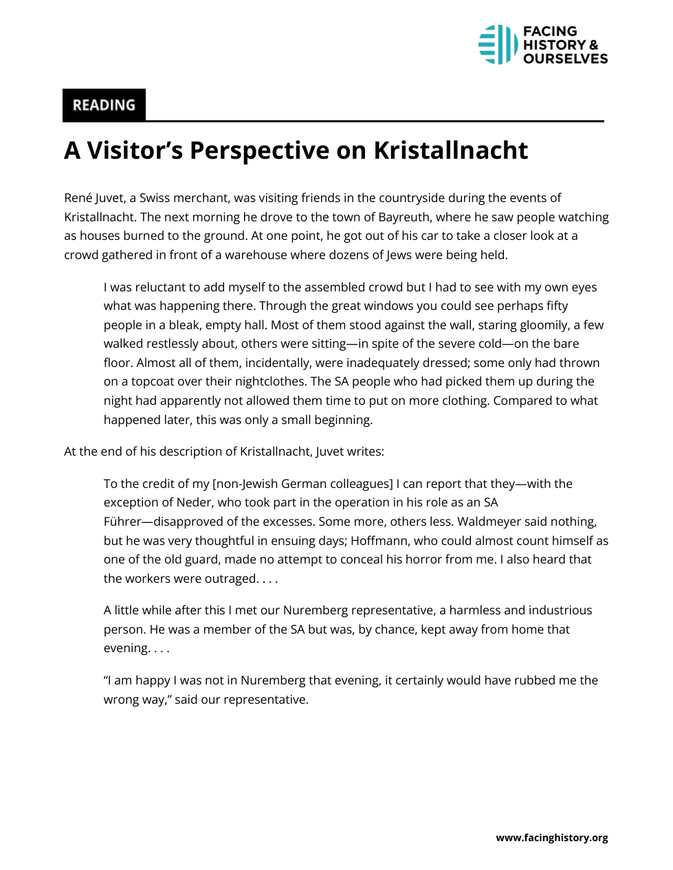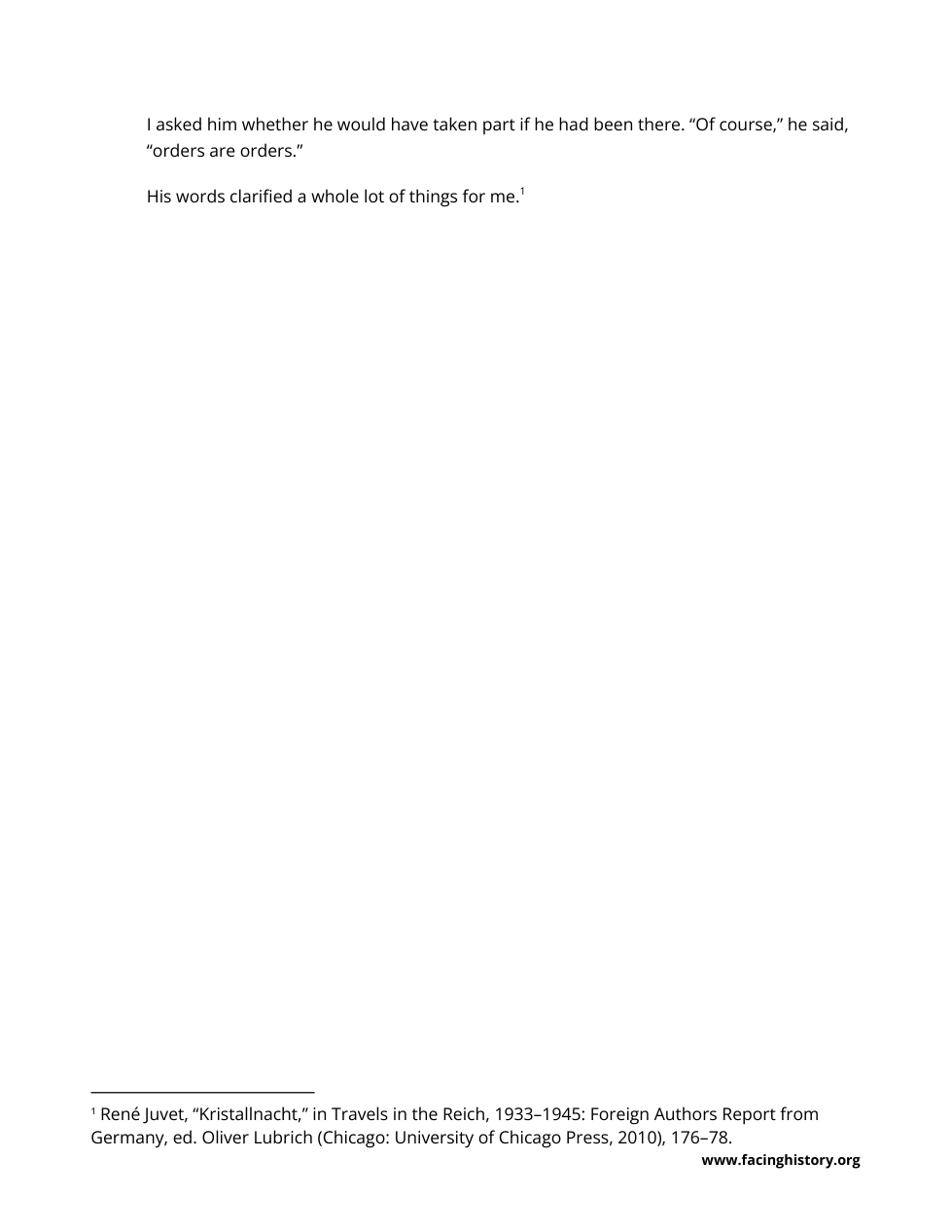 An SA member tells Juvet that even though he did not like the violence on Kristallnacht, he would have participated if called upon to do so, because “orders are orders.” What do you think Juvet means by writing, “His words clarified a whole lot of things for me”? What did the SA man’s words clarify for Juvet? What do the SA man’s words suggest to you? How might they help us understand why some people chose to participate? 3. Why might people participate in violence even if they don’t fully support its goals?