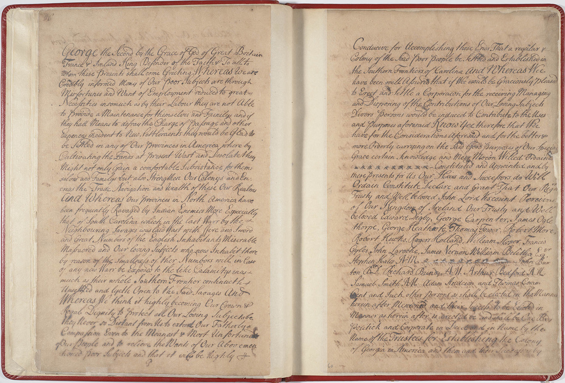Pictured above is the copy of the Charter of 1732 located in the Georgia Archives. This important legal document, issued by the British government, specified the colony’s boundaries, its form of government, the powers of its officials, and the rights of its settlers.