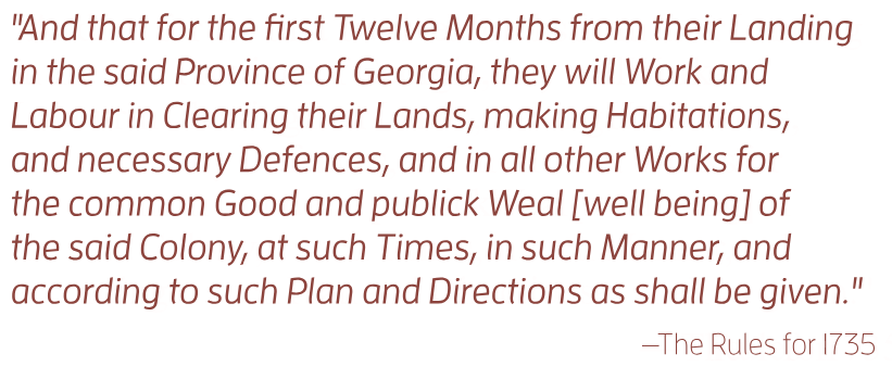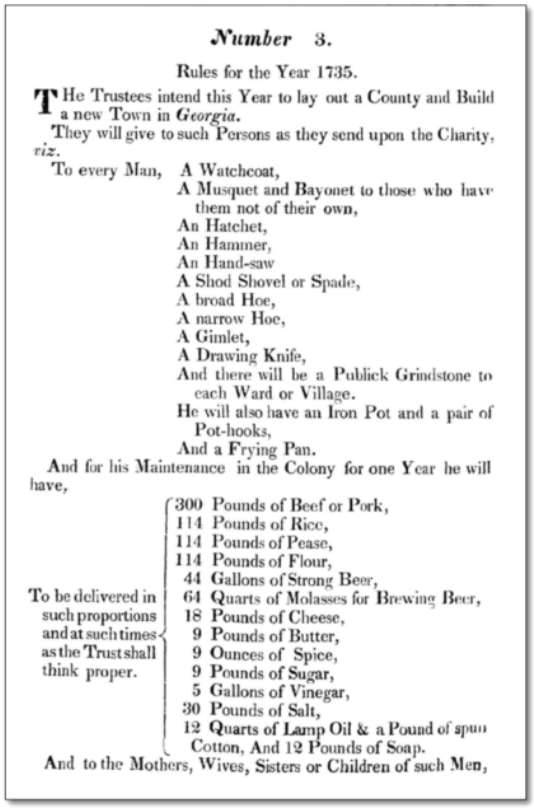 The rules outlined the provisions the Trustees made for the colonists and the requirements they had for them. To help those traveling “on charity” (who were too poor to pay for their passage), they provided a place to live until their ship sailed. When these colonists arrived, they would receive clothing, bedding, weapons, seeds, and tools for one year. They would be given 50 acres of land, which would be rent-free for 10 years. The colonists would not own the land, so they could not sell it or buy more. Each farm would have its owner in residence (living there), providing able-bodied men to defend the colony.