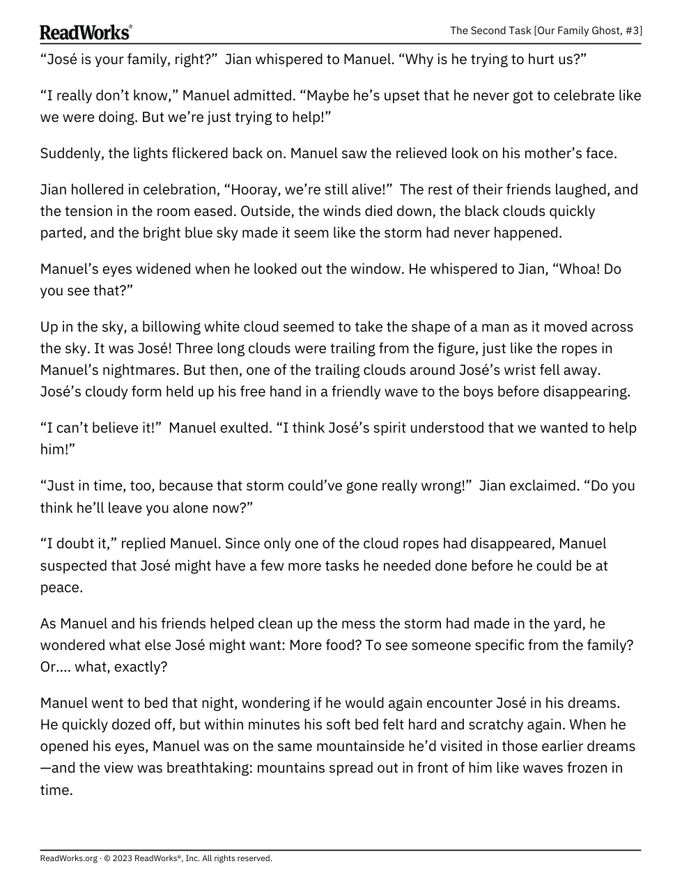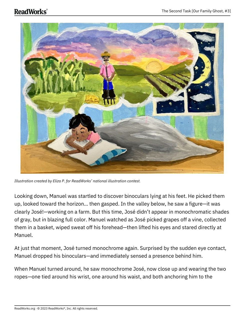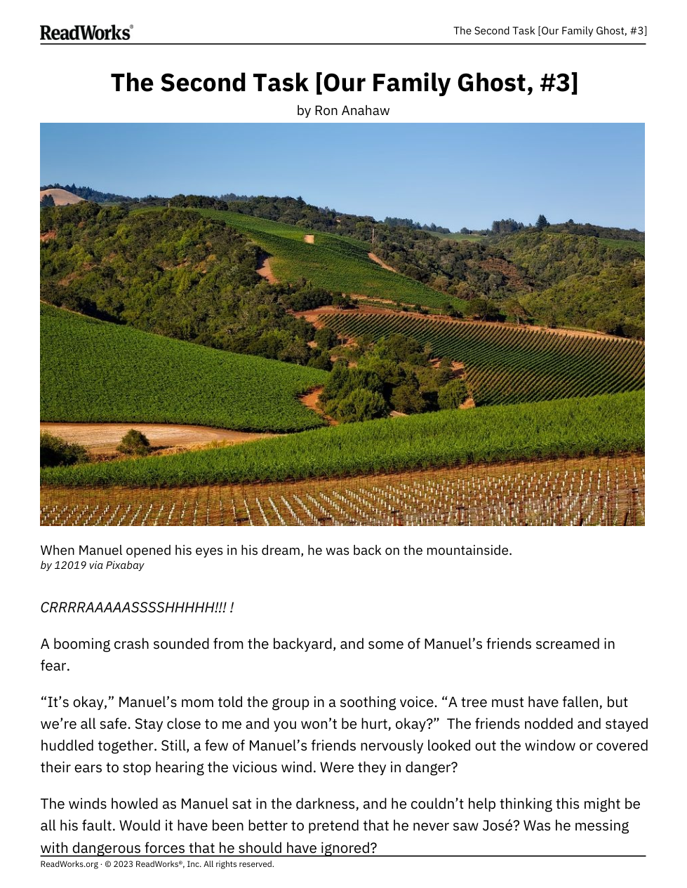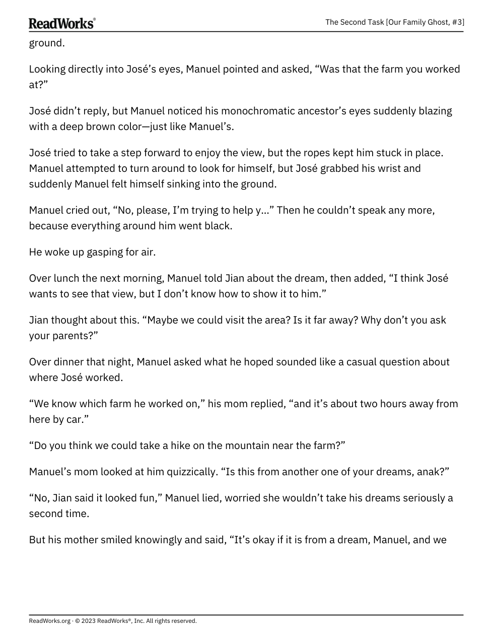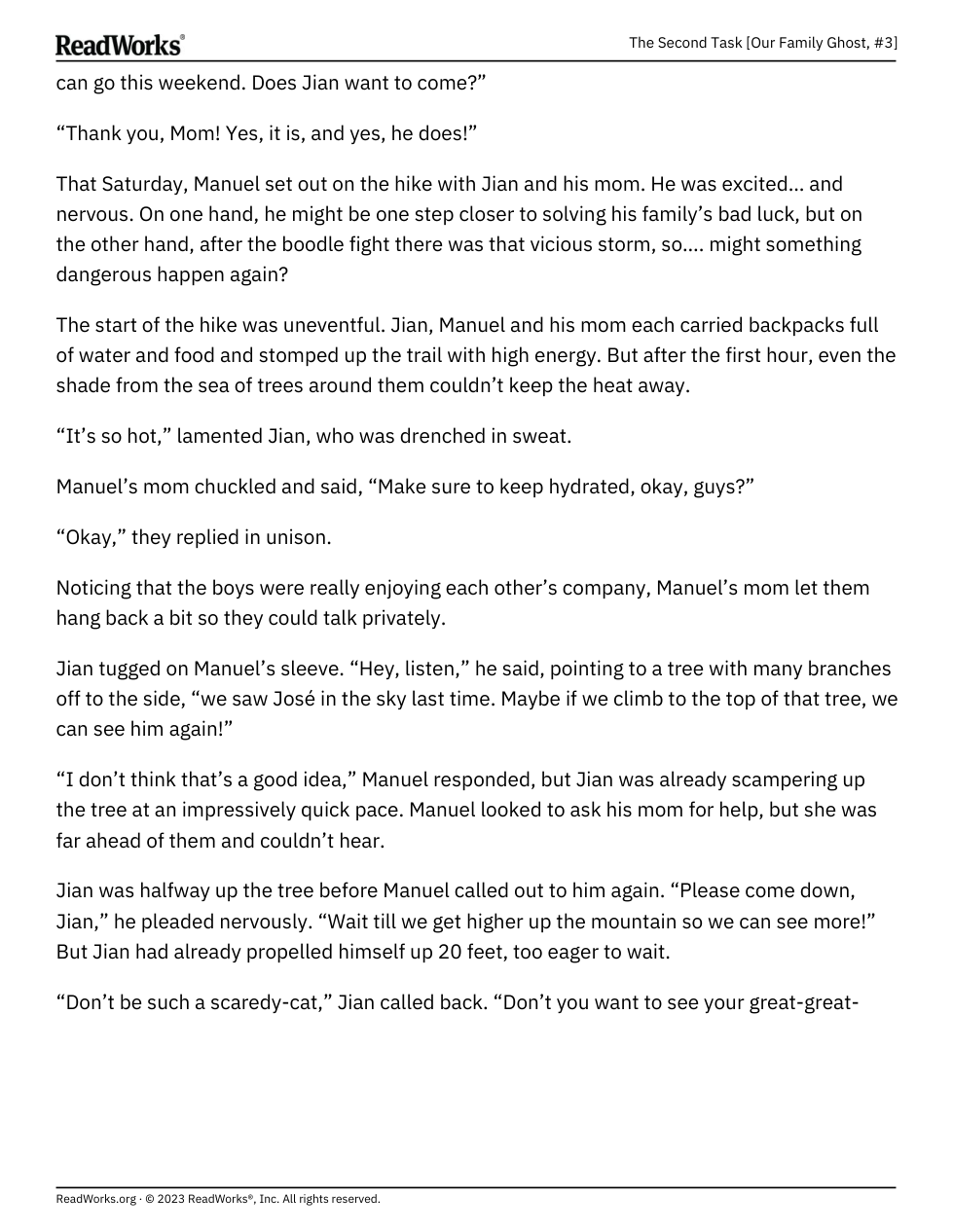 “Manuel was snapped out of his train of thought by the piercing sound of Jian’s yell. He looked up, just in time to see his best friend slip off a high branch and begin plummeting to the ground.”