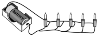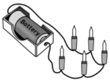 This circuit has four light-emitting diode (LED) lights. It also has a battery and a switch.