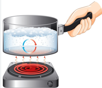 Explain using the diagram how convection occurs in boiling water in this saucepan