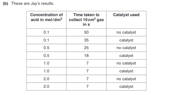 At concentrations of 1.0 and 2.0 adding a catalyst _____________ change the time taken to collect 10cm3 of gas.