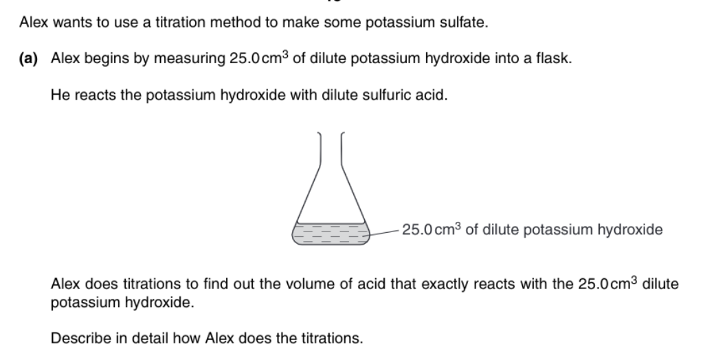 add acid to potassium hydroxide until the indicator changes ___________ (use a _______________ to make the colour change more obvious).