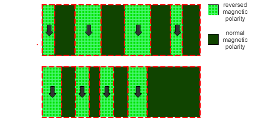 Magnetic striping is another piece of evidence of sea floor spreading. Magnetic material inside the molten rocks line up in the direction of Earth’s magnetic poles. These patterns reverse themselves when Earth’s magnetic poles reverse. Scientists have found that the patterns of these magnetic strips on each side of the mid-ocean ridge are a mirror image of each other. These areas with identical patterns show that the crust is spreading on both sides of the ridge at the same rate. This is evidence that new oceanic crust is created at the mid-point of the ridge, and that older crust is pushed away as new crust is forming.