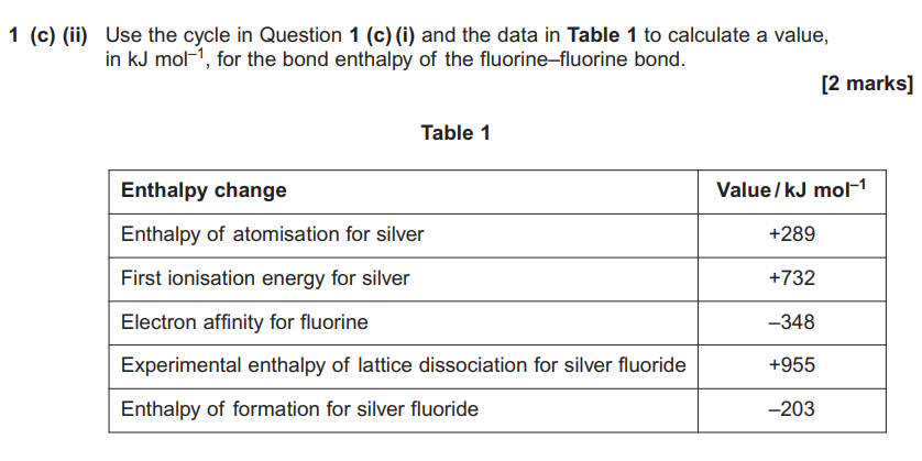 1/2 bond Enthalpy (F-F) = _______ kJmol