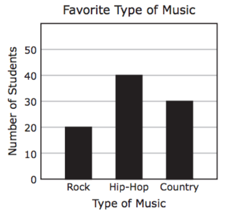 The graph shows the results of a survey of students’ favorite music. Based on the graph, how many students would you predict to choose hip-hop if 45 students were surveyed?