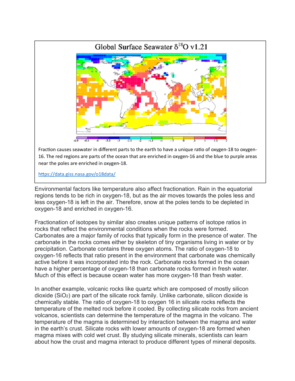 Which regions of the ocean are enriched in oxygen-16 and which regions are enriched in oxygen-18 due to fractionation of isotopes?