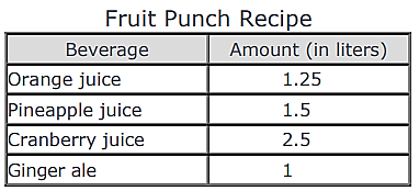 Chandra made fruit punch for a party. The recipe is shown in the table.
