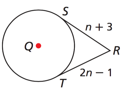 Find the value of n. Line RS and line RT are tangent to circle Q.