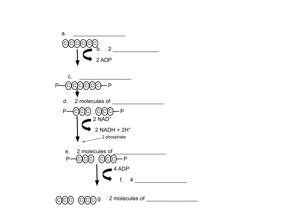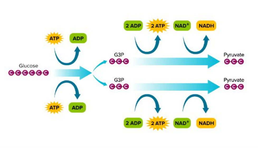Step 1: Two phosphate groups are attached to one molecule of glucose, forming a new 6-carbon compound. The phosphate groups are supplied by two molecules of ATP, which are converted into two molecules of ADP in the process.