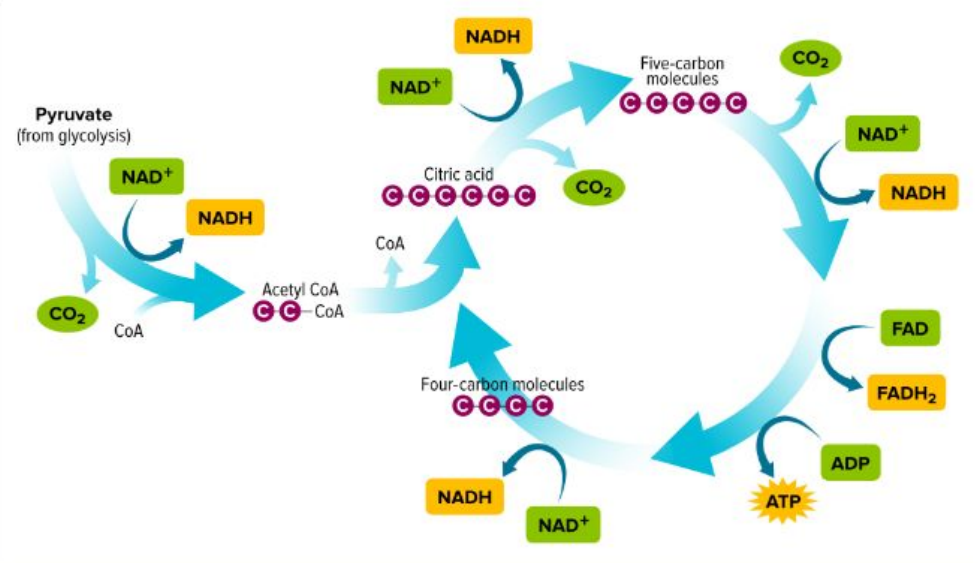 Step 2: Citric acid releases a CO2 molecule and a hydrogen atom to form a 5-Carbon compound. The electron in the hydrogen atom is transferred to NAD+, reducing it to NADH.