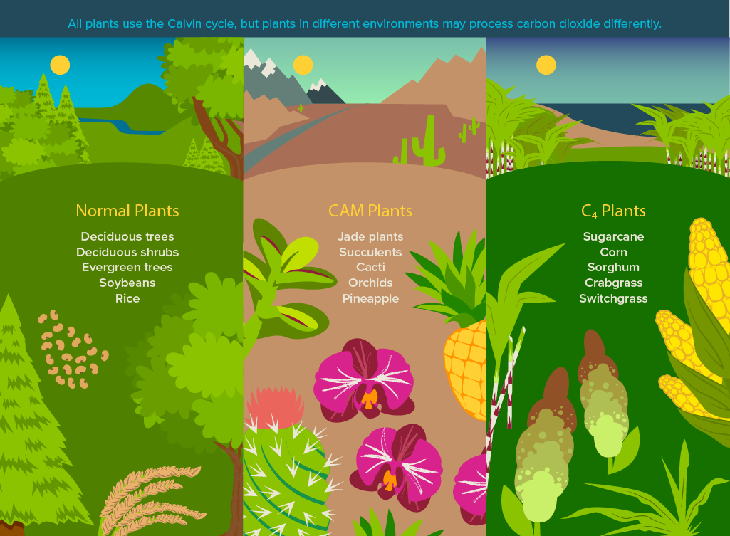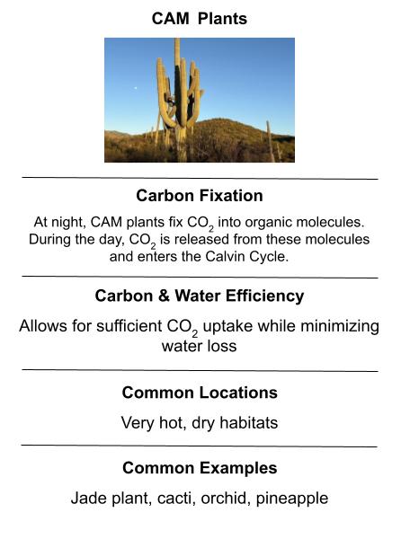 Another adaptive pathway used by some plants to maximize photosynthetic activity is called crassulacean acid metabolism (CAM photosynthesis). The CAM pathway occurs in water-conserving plants that live in deserts, salt marshes, and other environments where access to water is limited. CAM plants, such as cacti, orchids, and pineapple, allow carbon dioxide to enter the leaves only at night, when the atmosphere is cooler and more humid. At night, these plants fix carbon dioxide into organic compounds. During the day, carbon dioxide is released from these compounds and enters the Calvin cycle. This pathway also allows for sufficient carbon dioxide uptake while minimizing water loss.