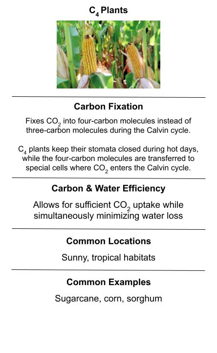 One adaptive pathway that helps plants maintain photosynthesis while minimizing water loss is called the C4 pathway. The C4 pathway occurs in plants such as sugarcane and corn. These plants are called C4 plants because they fix carbon dioxide into four-carbon compounds instead of three-carbon molecules during the Calvin cycle. C4 plants also have significant structural modification in the arrangement of the cells in the leaves. In general, C4 plants keep their stomata (plant cell pores) closed during hot days, while the four-carbon compounds are transferred to special cells where CO2 enters the Calvin Cycle. This allows for sufficient carb dioxide uptake while simultaneously minimizing water loss.