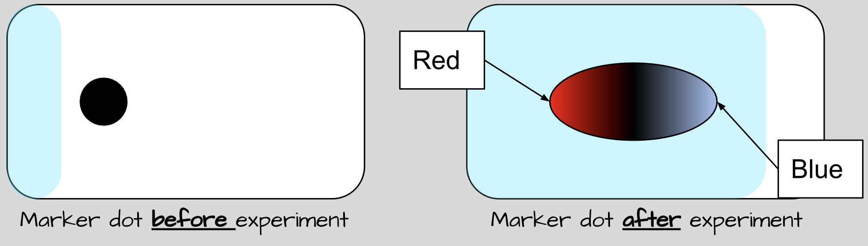 The water moved the blue ink molecules farther up the paper than the red ink molecules.