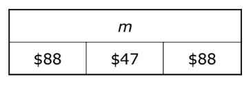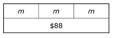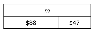 Jasmine earned $88 for babysitting on Friday and $47 for mowing lawns on Saturday. She took her total money earned and used it all to buy 3 new dresses. If each dress cost the same price, which strip diagram represents m, the amount of money each dress costs?