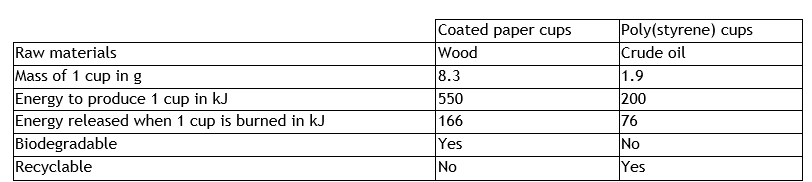Disposable cups are made from coated paper or poly(styrene). The table below shows information on the life cycle assessments (LCAs) of disposable cups.