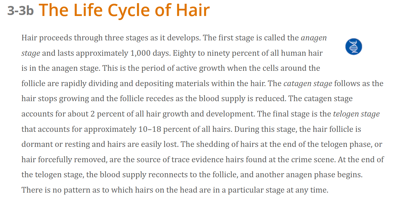 anagen stage | arrow_right_alt | active growth period of hair; 80--90% of hairs are in this phase for humans |